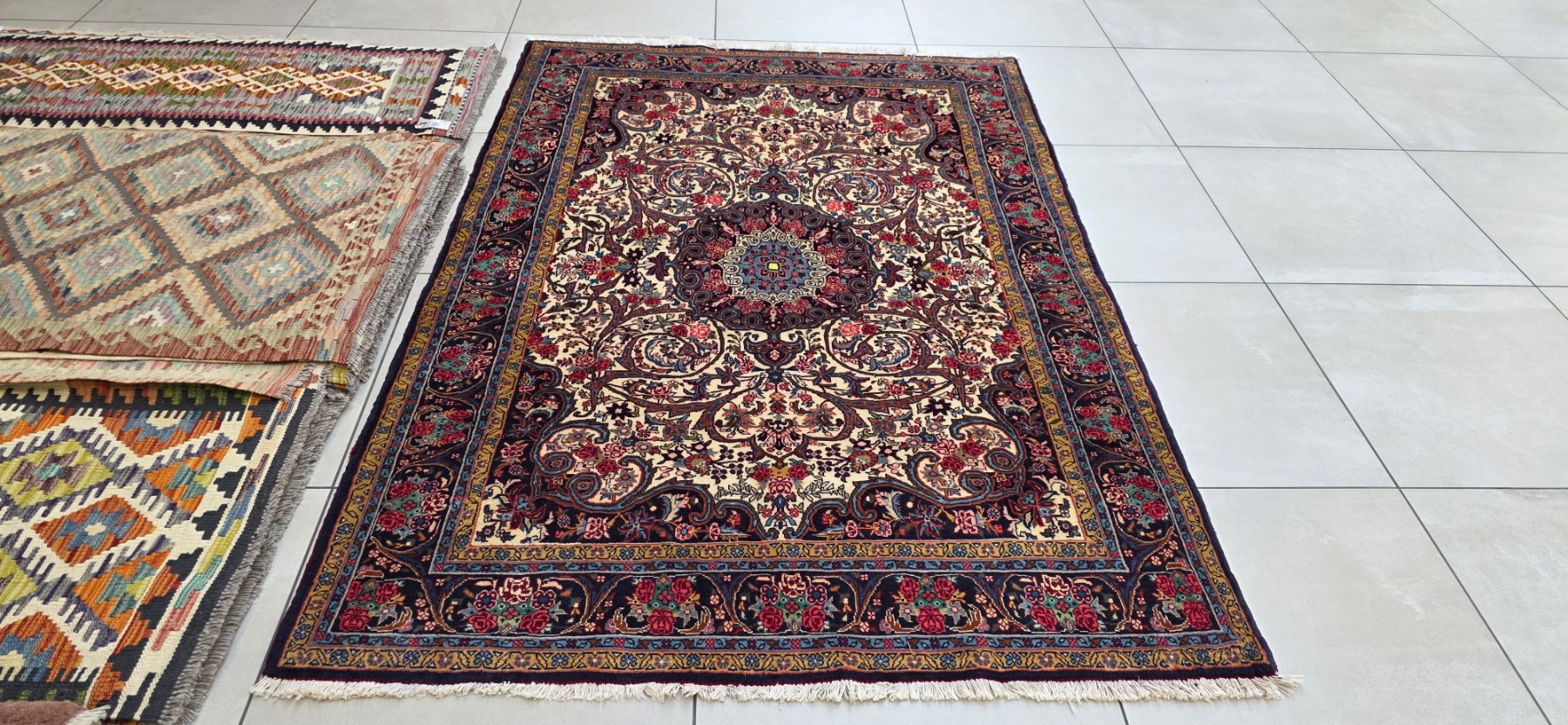 The most common pattern is the Herati (also called fish pattern), but also medallions and floral motifs occur. Bidjar carpets are manufactured in most sizes, from zaronim (150×100 cm) and larger sizes. They have a sober elegance and fit in most environments. Their durability makes the carpets very suitable for public environments.