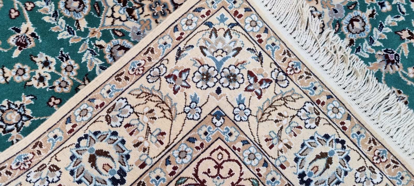 In connection with Nain carpets some denominations occur; 4La, 6La and 9La, where “La” in farsi means layer. This denomination is used to decide the quality of a Nain carpet and it refers to the number of layer of threads that have been used in every warp-thread at the manufacturing of the carpet. The lower the number the finer and higher density the knots the carpet has. It is possible to check how many layers have been used in a carpet by counting the number of threads in one of the fringes of the carpet – if you can see 3 pairs of the thread then it is a Nain 6La carpet.
