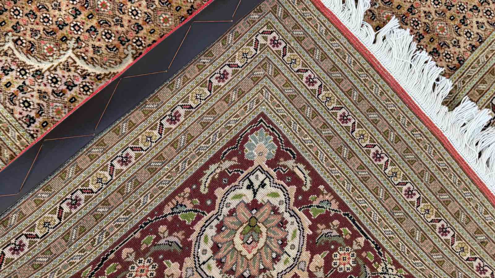 The term Raj in connection with the name of Persian Tabriz carpets refers to the number of knots in a 70 mm span range. The denomination 40 Raj refers to carpets with 400-500.000 knots/m2, 50 Raj to carpets with approximately 500-600.000 knots/m2, 60 Raj to carpets with 600-800.000 knots/m2 and 70 Raj to carpets with approximately 800-1.000.000 knots/m2. The last-mentioned being extremely rare in today’s market.