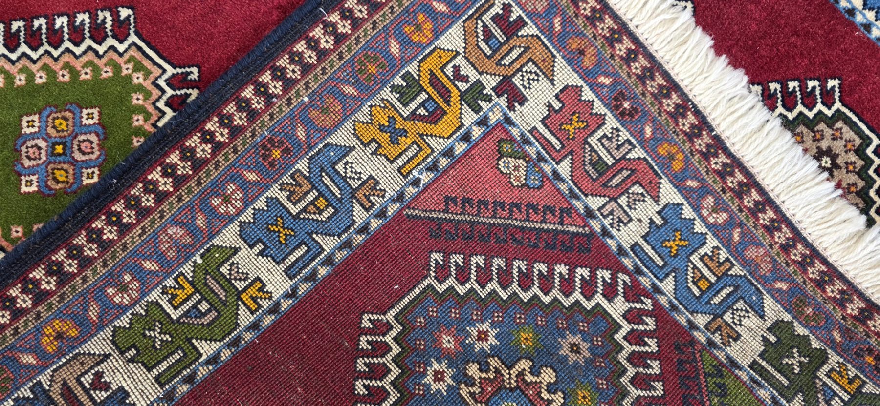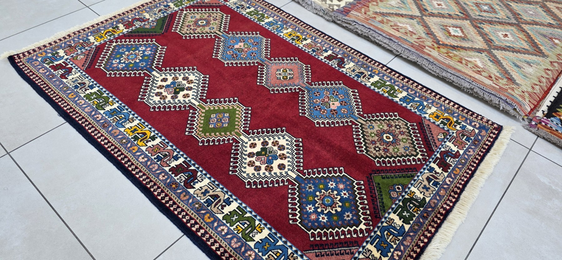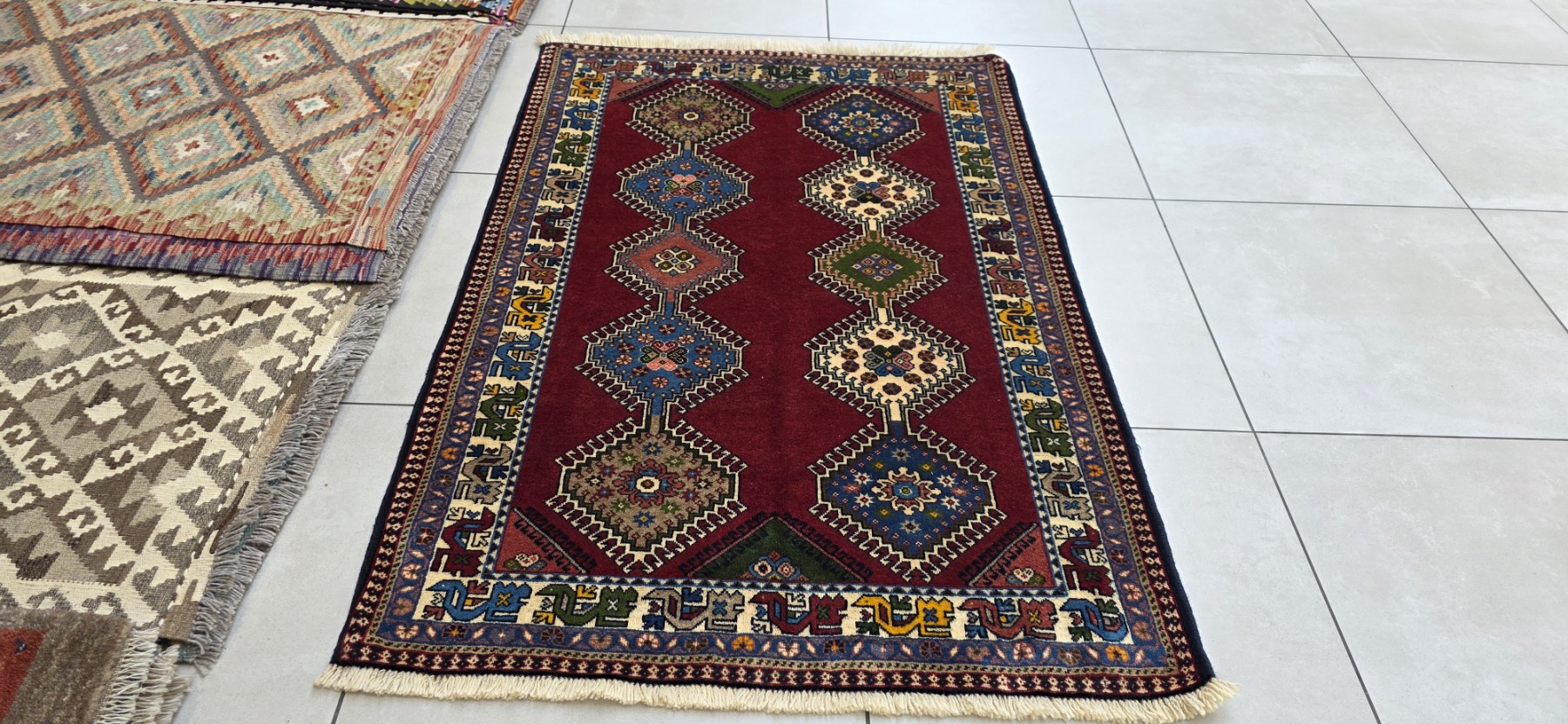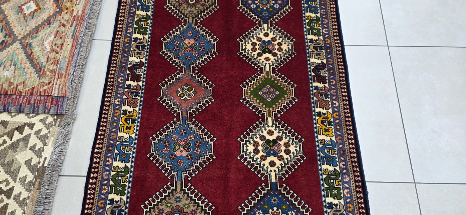 They are similar in design to Shiraz, Qashqai, and Khamseh rugs, although they usually have brighter colors than most Persian rugs. Yalameh rugs have a unique and very recognizable latch-hooked diamond medallion like the one pictured below. They are usually woven with wool on a cotton foundation, but may also have wool foundations. . These rugs come in a variety of sizes, and are perfect for tribal decor.